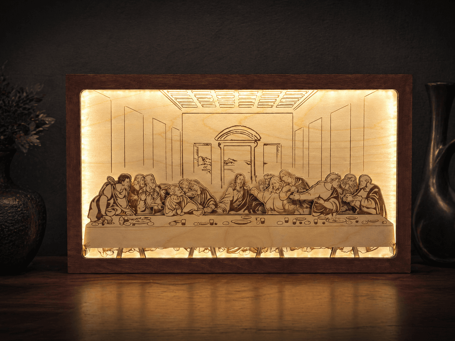 The Last Supper is one of the most recognized and celebrated scenes in Christian history. Depicting Jesus and his twelve apostles gathered for a final meal, this iconic scene has inspired artists and craftsmen for centuries. Our 3D LED wooden version brings this powerful moment to life in a completely new and modern way.